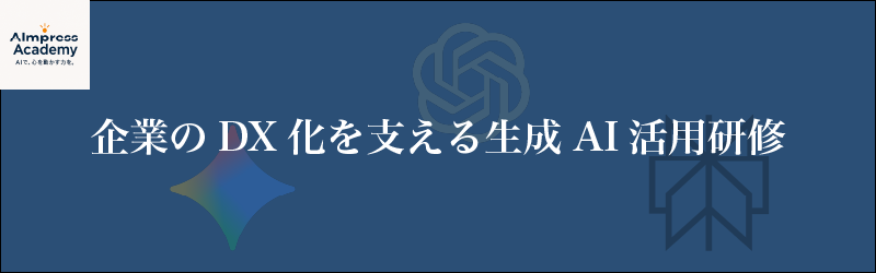 AImpress Academyでは、DX(デジタルトランスフォーメーション)を推進するための生成AI活用研修を提供します。この研修は、あなたが無駄な時間を削減し、業務を効率化する手助けをすることを目的としています。一緒に、文書作成、情報収集、そしてエクセルや他のソフトウェアの活用など、日常の業務をより簡単に、より効果的に行えるようになりましょう!